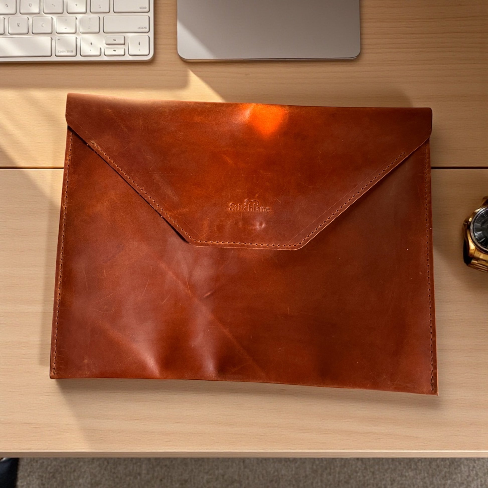 • The natural marks, warm tones, and hand-stitched detailing give this sleeve an authentic old-world feel, making it as unique as the person carrying it.